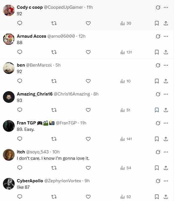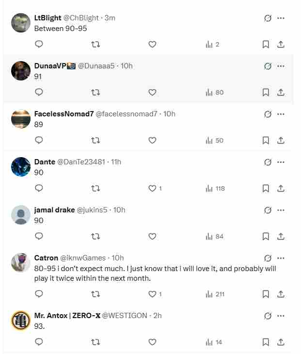 评论区中,大多数玩家预测《死亡搁浅2》的M站评分在90分以上,给出92分的玩家居多。有玩家表示,如果游戏的评分低于90分,我会感到非常惊讶。但也有一些玩家对新作持保留意见,认为前作就没能拿到90分,因此不理解为什么大家会认为续作会取得如此高的评分。