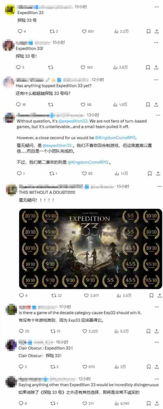 这则推文发出后,众多玩家在评论区里进行了热烈讨论,其中呼声最高的游戏则是由法国开发商Sandfall Interactive制作的即时战斗回合制JRPG《光与影:33号远征队(Clair Obscur: Expedition 33)》。很多玩家表示,《光与影:33号远征队》有着出色的剧情与玩法,它能够成为今年年度最佳游戏的有力竞争者。