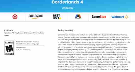 根据美国娱乐软件评级委员会(ESRB)的描述,《无主之地4》被评为M级(17岁以上)。评级说明列出了过去游戏系列中包含的许多经典元素,并指出游戏包含“内购内容”及“用户互动功能”。