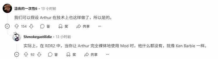 不过,也有玩家“实锤”辟谣:在《大镖客2》中使用不穿衣服MOD后发现,主角亚瑟的关键部位压根没有建模,R星似乎并未为男性角色设计此类细节。