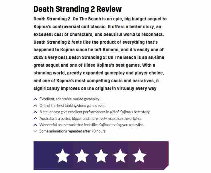 《死亡搁浅2:冥滩之上》是小岛秀夫充满争议的邪典经典游戏的史诗级续作。它带来了更出色的故事、绝佳的角色阵容,以及一个需要重新连接的美丽世界。这款游戏仿佛凝聚了小岛离开科乐美后经历的一切,堪称2025年最优秀的作品之一。《死亡搁浅2:海滩》是堪称有史以来最出色的续作之一,也是小岛秀夫最杰出的游戏之一。凭借惊艳的世界观、大幅扩展的游戏玩法与玩家选择,以及小岛作品中最引人入胜的角色阵容与叙事,本作几乎在各个方面都超越了前作。