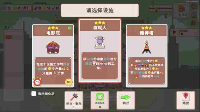 从随机抽取的设施中进行选择并建造在地图上,当居民进入设施后就会开始工作,赚取报酬。