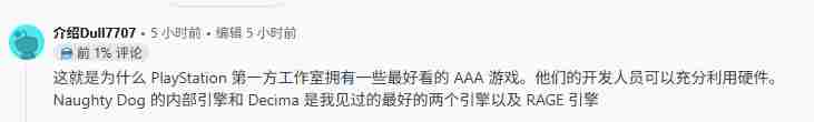 此外,也有网友赞扬PlayStation第一方游戏开发者,他们能充分发挥硬件性能,制作出画面精美的顶级3A游戏。例如顽皮狗的引擎、游骑兵的引擎以及RAGE引擎都非常棒。