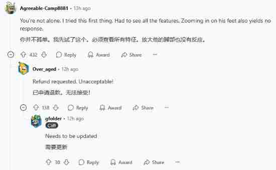 另一位玩家Agreeable-Camp8881也反馈,即便放大山姆的脚也不会触发任何特殊互动。更有玩家调侃"完全无法接受,已经申请退款!"。