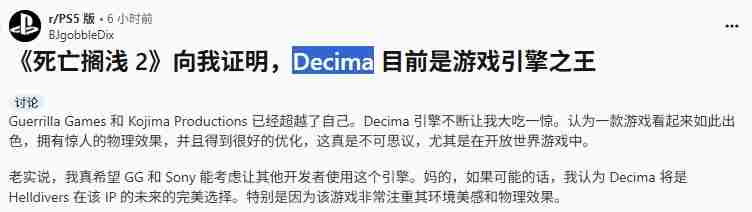 Reddit论坛热帖,网友BJgobbleDix发文称《死亡搁浅2》向他证明了游骑兵的Decima是目前最棒的游戏引擎,游骑兵和小岛工作室已经超越自我。他认为Decima不仅看起来出色,还有优秀的物理效果,并且优化也很棒,对于一款开放世界游戏来说,真的是不可思议。