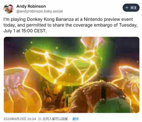 外媒VGC编辑Andy Robinson在Bluesky上发布消息称,在任天堂的预览活动中,他提前试玩了《咚奇刚:蕉力全开》,将在7月1日星期二上午9点(北京时间)解禁。。这或许意味着媒体评测将于7月1日发布。