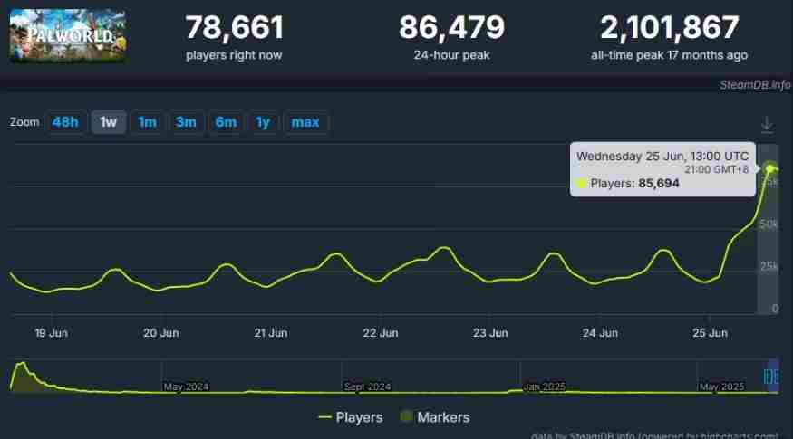 本次更新整合优化了任务系统,帕鲁新增游泳动画与速度调整使互动更自然。竞技场模式获得强化并实装单人挑战模式,更多细节可参阅官方steam公告。更新首日Steam同时在线人数即从3.7万回升至8.6万峰值,显示出玩家对此次重大更新的热烈反响。