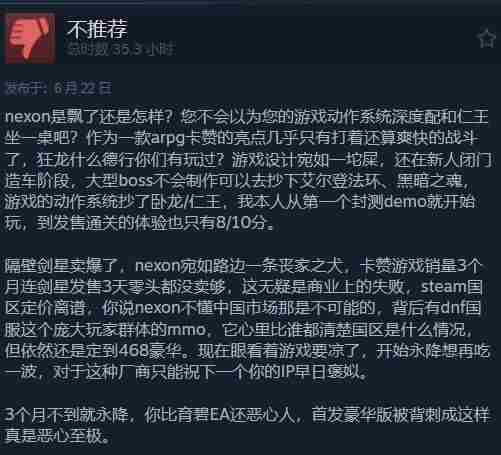 部分玩家表示这是自己首次因价格问题给游戏打差评,批评厂商“背刺”轻视首发玩家。此外,也有玩家指出游戏本身存在设计缺陷,对比同期热卖的《剑星》,《卡赞》三个月的销量甚至不及《剑星》三天的零头,简直是商业上的失败。