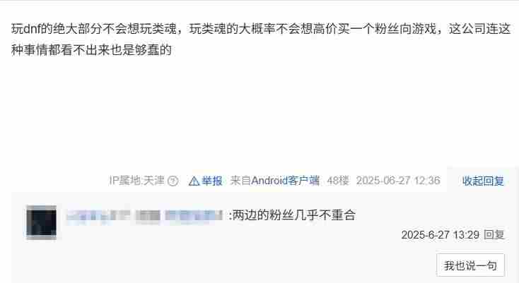 针对此次降价,玩家群体意见不一。有玩家认为:“DNF粉丝未必喜欢类魂游戏,而类魂玩家又未必愿意高价购买一款粉丝向作品,两者的受众重合度本就不高。” 那么,你是否也被这次降价“背刺”了呢?