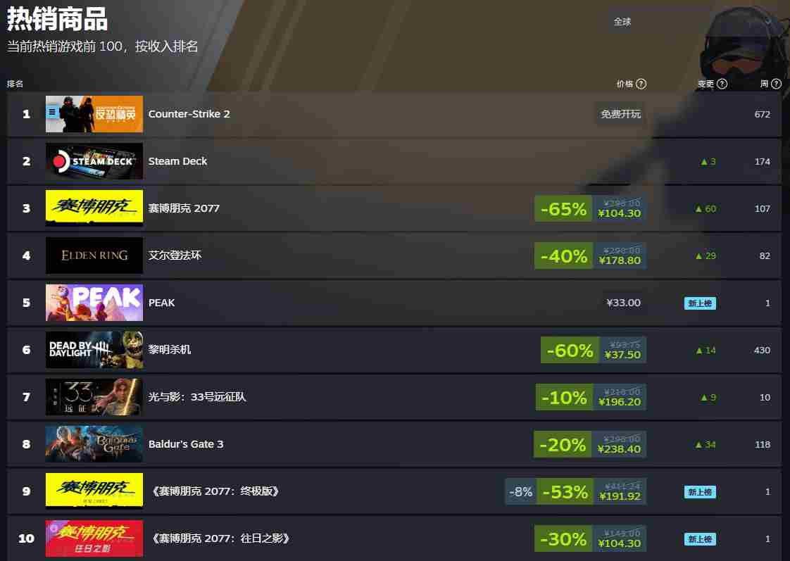 根据Steam的数据,《赛博朋克2077》已成功登顶全球热销榜(排除免费游戏和Steam Deck),超越了《艾尔登法环》和《PEAK》等作品。