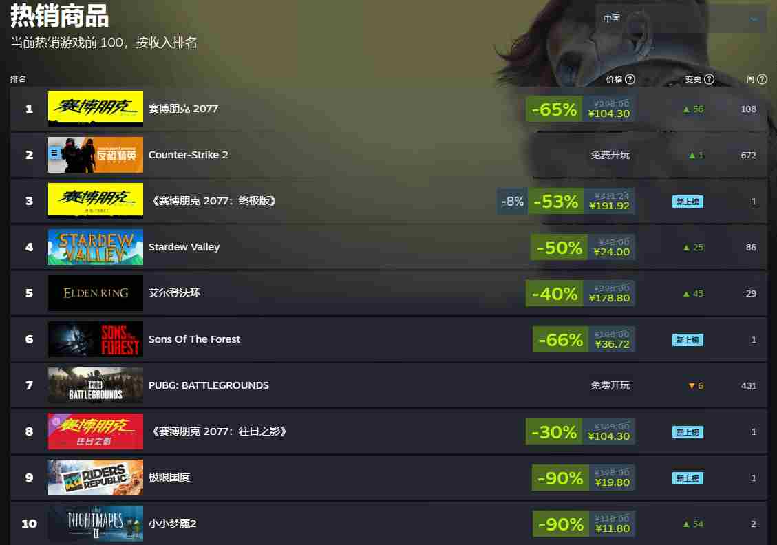 在国区热销榜上,《赛博朋克2077》同样位居榜首,紧随其后的是《星露谷物语》和《艾尔登法环》。