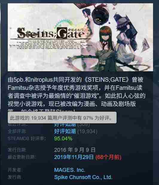 截稿之前,《命运石之门》在Steam全部评测为“特别好评”,19934条用户评测,好评率高达97%。