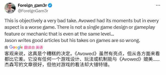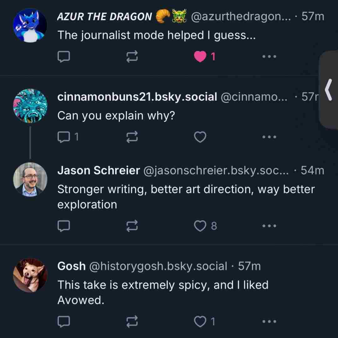 随后,Schreier解释称《宣誓》胜在有“更强大的剧情”、“更好的艺术方向”和“好很多的探索”,但一名玩家立马纠正说:“玩过这两款游戏后,他的看法错得离谱。”
