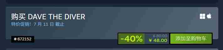目前,《潜水员戴夫》在Steam平台6折促销中,原价80元,现价48元。优惠活动截止到7月11日,对于喜爱探索和经营游戏的玩家这款游戏绝对值得一试。