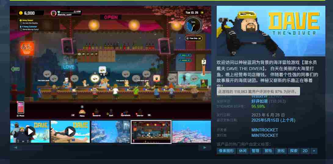 《潜水员戴夫》曾于2023年6月28日正式发售,本作是一款由NEXON旗下子品牌MINTROCKET开发的一款像素类洋探险游戏。海洋冒险和经营模拟的玩法结合受到很多玩家的喜爱,本作目前在Steam平台全部评测为“好评如潮”,118063条用户评测中,好评率高达97%。