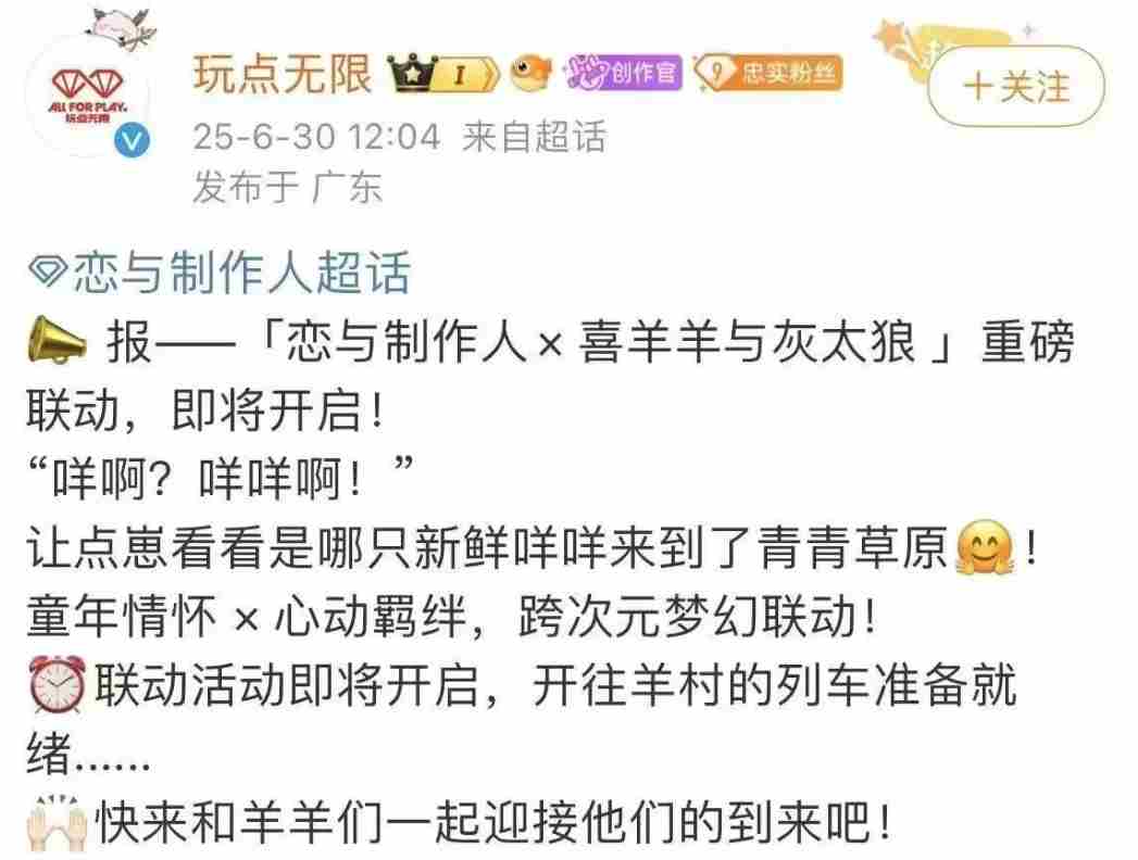 此次联动并非孤例。据角研社统计,2025年上半年,《喜羊羊与灰太狼》已参与6起品牌合作,涵盖潮玩、食品、主题店等多领域。与《闪耀暖暖》的联动中,登录即送美羊羊服饰的活动曾引发玩家集体“晒欧”。业内人士指出,经典IP的跨界合作正成为游戏行业的新趋势,其核心在于唤醒用户情感记忆,通过“童年滤镜”降低获客成本。
