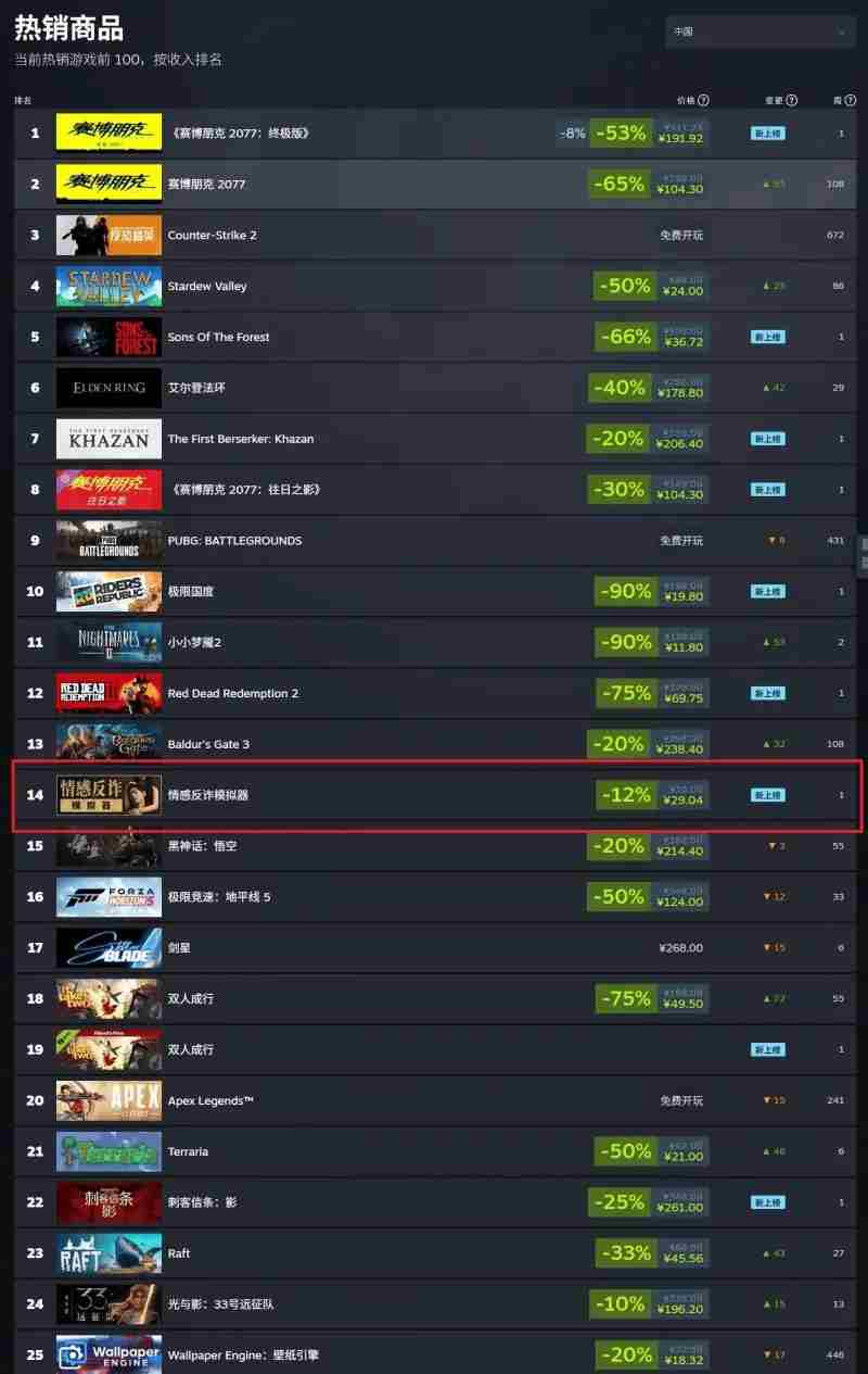 作为新近发售的游戏,《情感反诈模拟器》也参与了本次促销,提供12%的折扣优惠,并成功跻身国区热销榜第14位,排名超过《黑神话:悟空》及部分折扣力度更大的知名作品。
