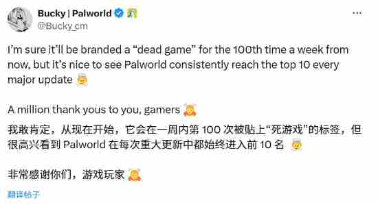 “我敢打赌下周又会有人第100次说它‘凉了’,但每次重大更新我们都能稳定回到Steam前十。谢谢你们,玩家们!”
