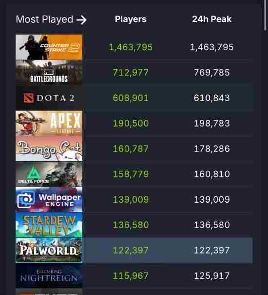 根据SteamDB数据显示,截至目前,《幻兽帕鲁》在过去24小时最高同时在线玩家数达122,512人,当前在线人数也稳定在7万人左右,位居Steam最热门游戏第九位。