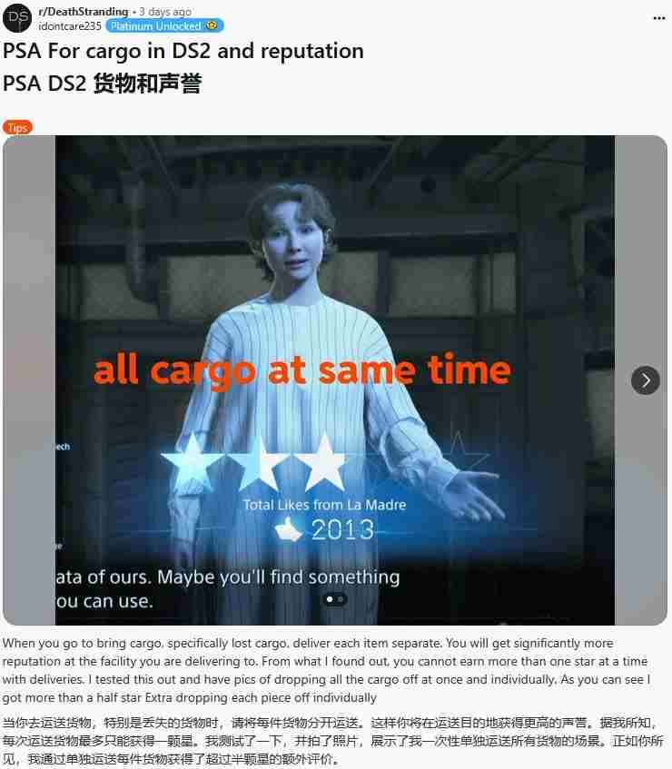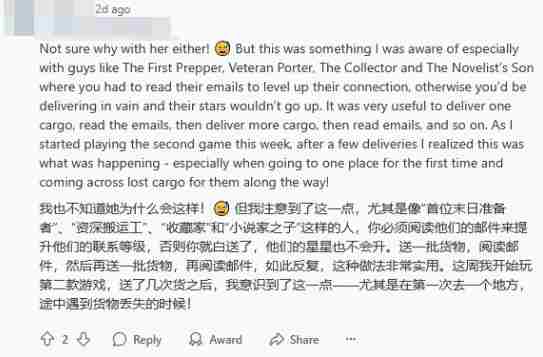 不过近日经过Reddit玩家idontcare235的测试发现,运送货物时,特别是在执行运送丢失货物的任务时,最好还是把每件货物分开运送,而不是一次性全部送达。这样能在结算时提升更多星级评价。