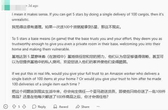 也有玩家认为这套机制有其合理性,五星评价不仅是对玩家辛苦工作的认可,也是在一次又一次送货流程中逐渐建立起来的信任和羁绊的体现,而这恰恰反映了游戏“连接”的主题。