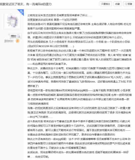 还有玩家表示,《明末:渊虚之羽》的地图指引达到了《黑暗之魂》的水平,且敌人的动作设计出色,战斗体验较爽。