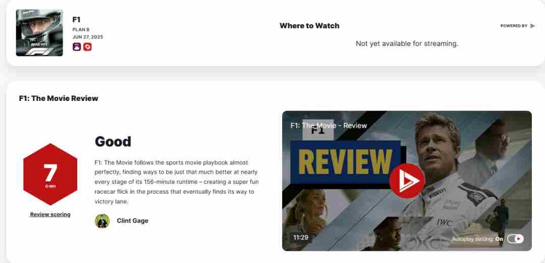 IGN对《F1:狂飙飞车》的评分是7/10:“《F1:狂飙飞车》几乎完美地遵循了体育电影的套路,在156分钟的片长中几乎每个环节都力求精益求精——打造出一部超级有趣的赛车电影,最终成功驶向胜利之路。”