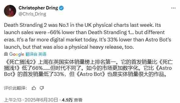 在英国PS商店的畅销榜上,小岛工作室的这款新作仅次于《EA Sports FC 25》,但目前索尼并未公开实时玩家数等详细数据,因此难以进一步分析其市场表现。