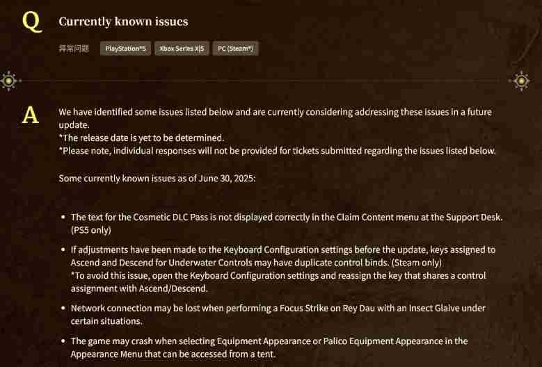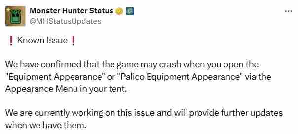 在 社交平台上,Capcom 提到:“我们已确认,当玩家在帐篷中通过‘外观菜单’打开‘装备外观’或‘随从猫装备外观’时,游戏可能出现崩溃。”