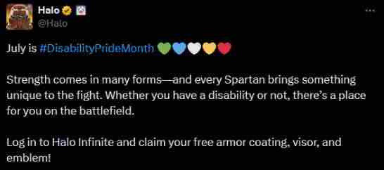 而近日,《光环:无限》为纪念残障骄傲月宣布新免费皮肤,配色为残障骄傲旗配色。