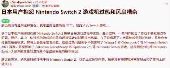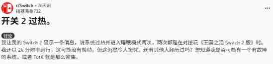 夏日炎炎,Switch 2却遭遇了热情过度的尴尬。海外玩家纷纷在社交平台上反映,设备在运行大型游戏如《赛博朋克2077》和《塞尔达传说王国之泪》NS2版时,频繁出现高温警告,甚至自动进入休眠状态。风扇狂转,游戏体验大打折扣。对此,我们建议玩家在游戏时保持设备通风,或考虑使用散热配件,以保障游戏体验。