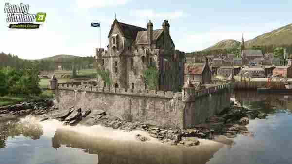 新地图"Kinlaig"以苏格兰高地为原型,呈现多风多云的崎岖丘陵地貌。场景保留古老城堡与中世纪风格小镇,并有双层巴士穿梭公路,营造浓厚历史氛围。玩家在务农或养殖之余,还可在岸边享受垂钓乐趣。