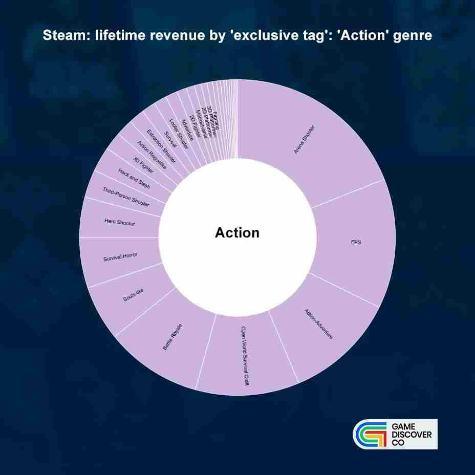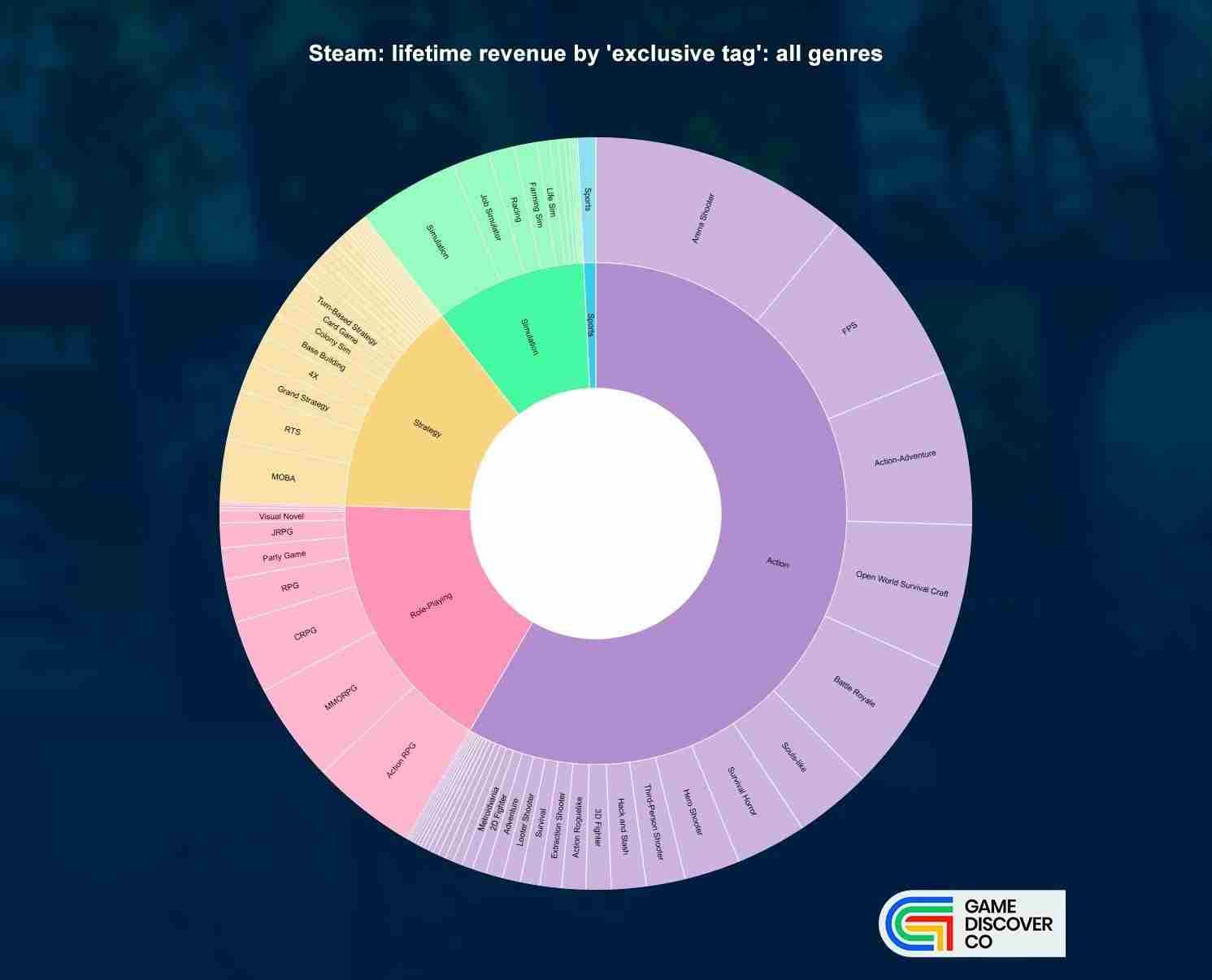 这份报告揭示了动作类游戏在Steam市场中的主导地位,尤其是通过爆款游戏的强力推动,收入高度集中在少数几款顶级作品上。