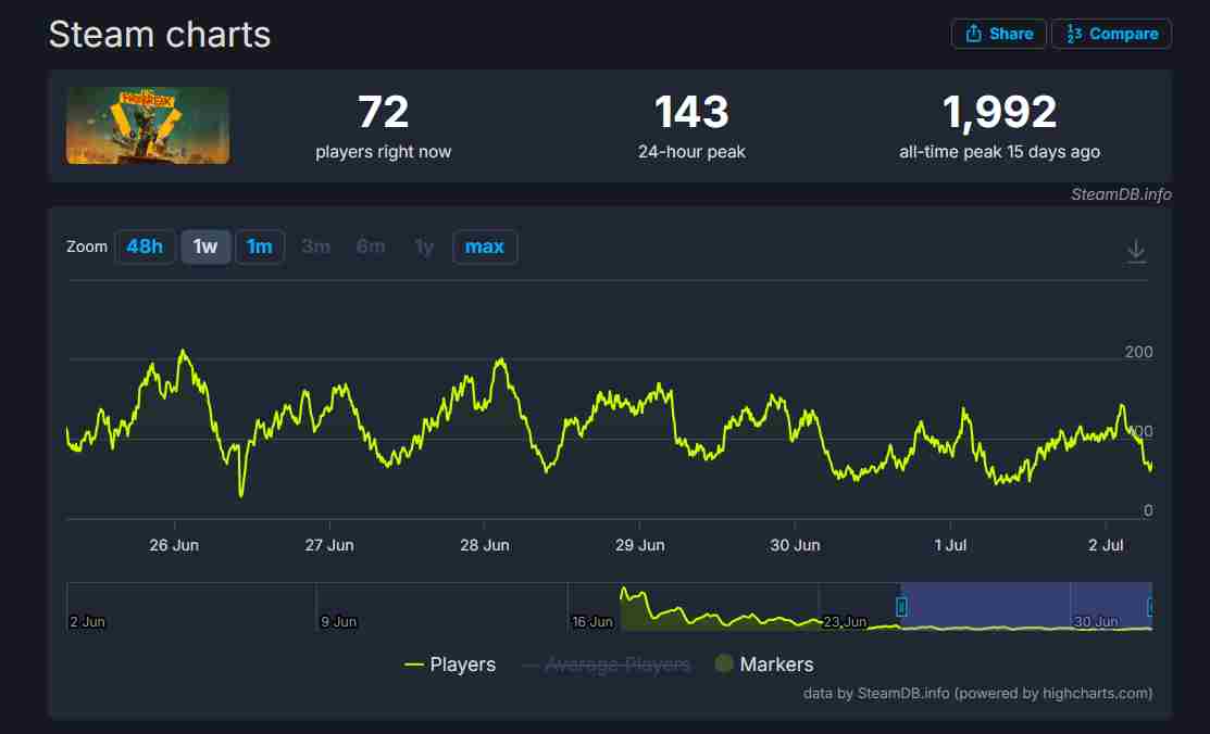 据Steamdb的数据,截稿之前,《FBC: Firebreak》在Steam平台的在线玩家峰值还不到2000人,24小时玩家数仅有143人,而当前的在线人数甚至不足百人。对于一款发售没多久的游戏来说,这个数字算是相当糟糕。