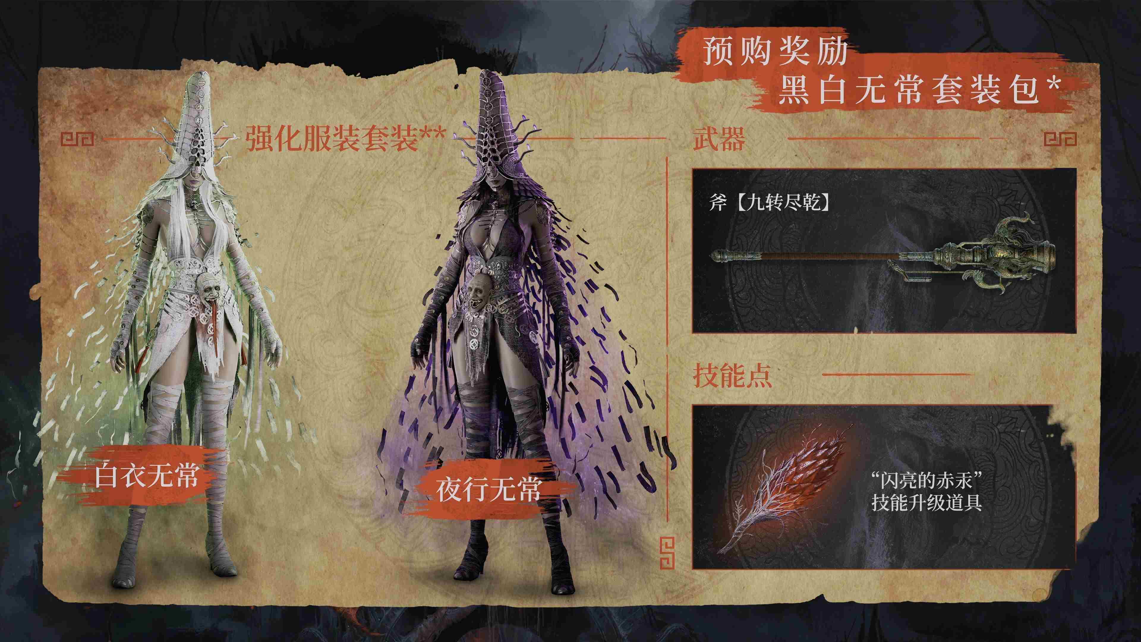 《明末:渊虚之羽》将于2025年7月24日正式发售,游戏的预购奖励包含两套“外观套装”夜行无常和白衣无常,预购豪华版的玩家将获得四套外观【引魂法衣】【金虎祥瑞】【流云织羽】【婉若游龙】以及四把武器【龙胆亮银枪——长枪】【赫梯弯刀——双刀】【龙吟斩月——长刀】【银星碎玉——单手剑】。