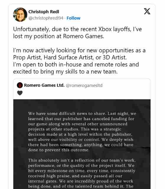尽管Romero未直接点名发行商,但结合时间节点判断,显然指向Xbox。前雇员Christoph Redl在转发工作室声明时更直接证实,项目取消确系此次Xbox大规模裁员所致。