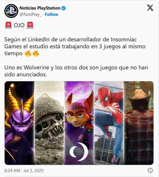 据@NotiPlay推主最新爆料,Insomniac Games的开发者在领英上曝光了工作室的近期计划正在同步开发三款神秘游戏。其中,《漫威狼人》已揭开面纱,而另外两款作品尚处于保密阶段,令人期待。