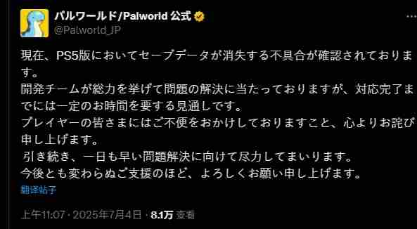 《幻兽帕鲁》PS5版遭遇技术难题,玩家存档不翼而飞。开发商Pocket Pair已证实此一问题,并承诺尽快解决。在此期间,玩家们不妨稍作等待,或尝试其他游戏以缓解焦急。
