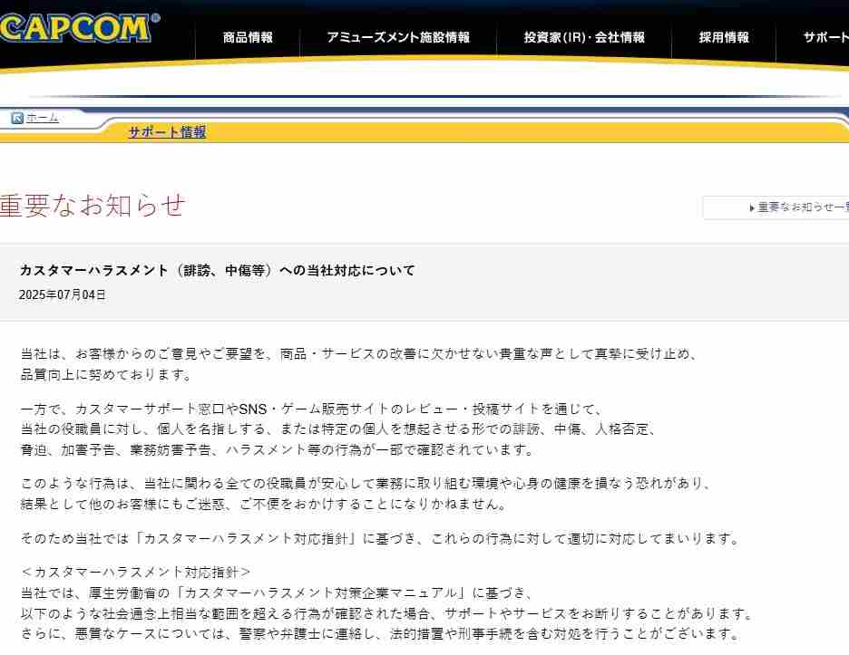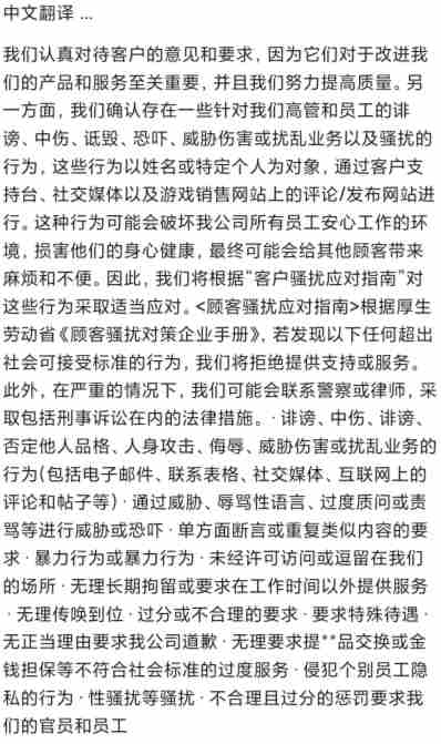 为维护员工与顾客的安全与尊严,卡普空将依据日本厚生劳动省制定的《顾客骚扰对策企业手册》,对超出社会常识标准的骚扰行为采取应对措施。