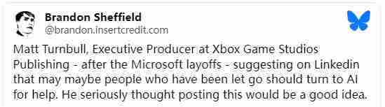 在游戏界动荡时期,Xbox发行部门执行制作人马特·特恩布尔的一则领英帖引起了争议。他建议失业同行使用ChatGPT或Copilot等工具进行职业规划和情绪支持,尽管其帖子已被删除,但这番言论提醒我们,技术在危机时刻也能成为助力。