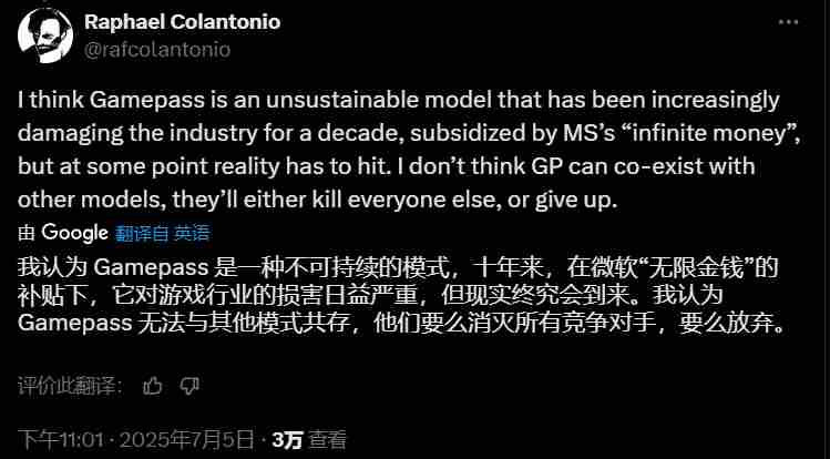 这一言论发表之际,微软正进行大规模裁员,涉及Xbox部门及旗下多家游戏工作室。Colantonio在发文中质问道:“没人愿意正视这个显而易见的问题?”——他口中的“问题”显然就是Game Pass。