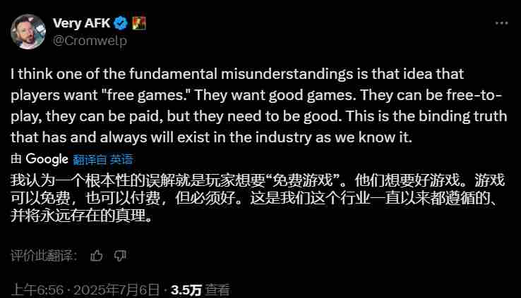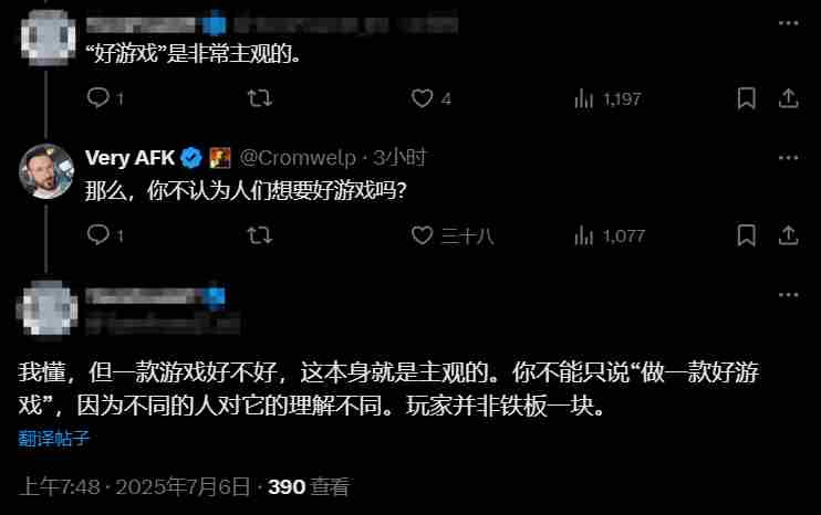 在评论区,有玩家反驳称“每个玩家对‘好游戏’的定义不同”,并认为这一标准过于主观,“你不能简单地说做一款好游戏,因为每个人对它的理解不同,玩家群体本身也不一致。”对此,Michael Douse坚持表示,这并不改变“玩家想要好游戏”这一普遍共识。