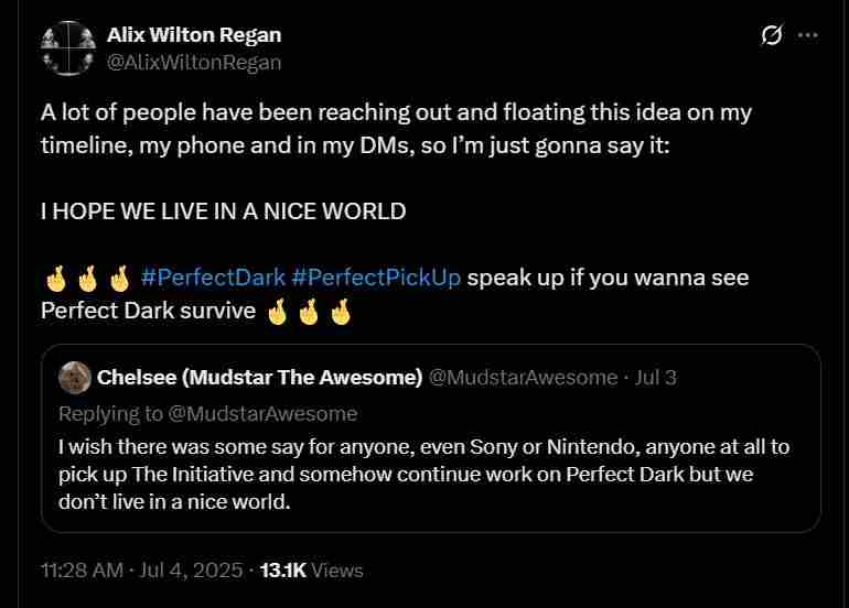 原本计划在《完美黑暗》中扮演 Joanna Dark 一角的演员 Alix Wilton Regan,在社交平台 X 上发文,恳请粉丝们伸出援手,助力复活这款游戏。她透露,自己的私信几乎被粉丝们的留言“淹没”,众多粉丝对《完美黑暗》十分关注,不断向她询问项目的相关情况。她期望粉丝们能勇敢站出来,为游戏的复活发声。