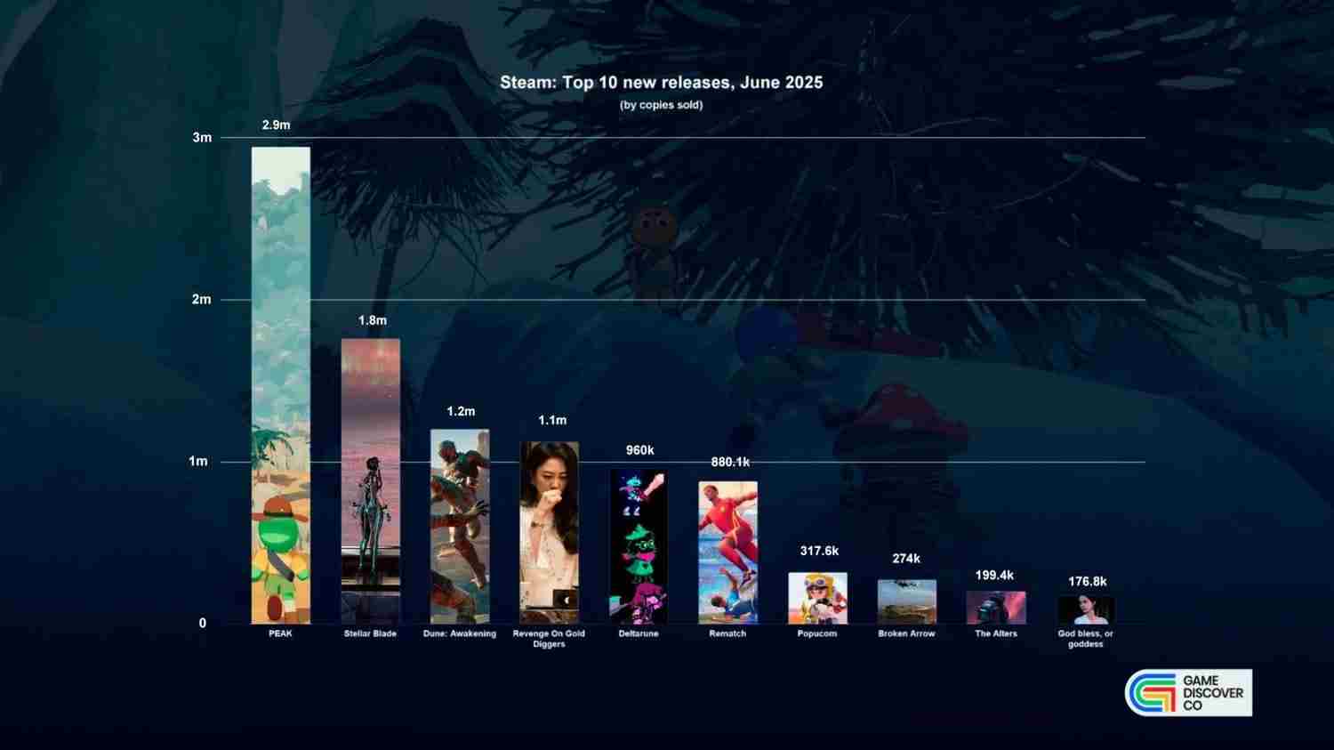 在销量方面,《PEAK》以290万套位居榜首,其次是《剑星》180万套和《沙丘:觉醒》120万套。其他进入销量排行榜的游戏还包括《情感反诈模拟器》、《三角符文》、《开球!REMATCH》等。
